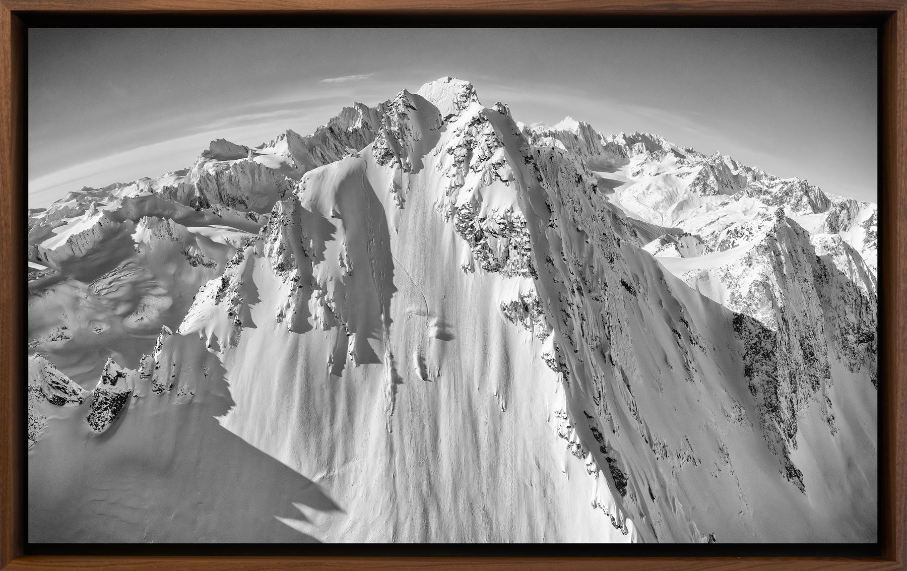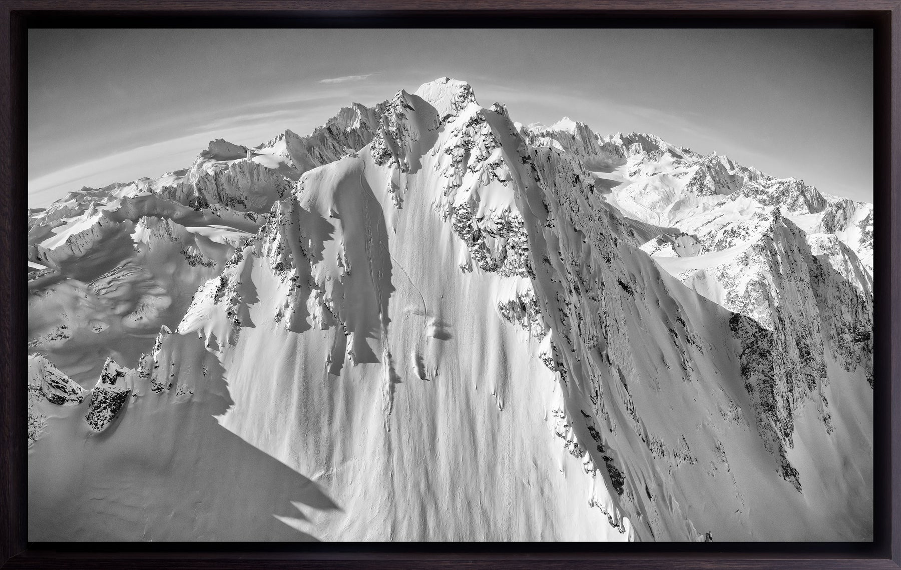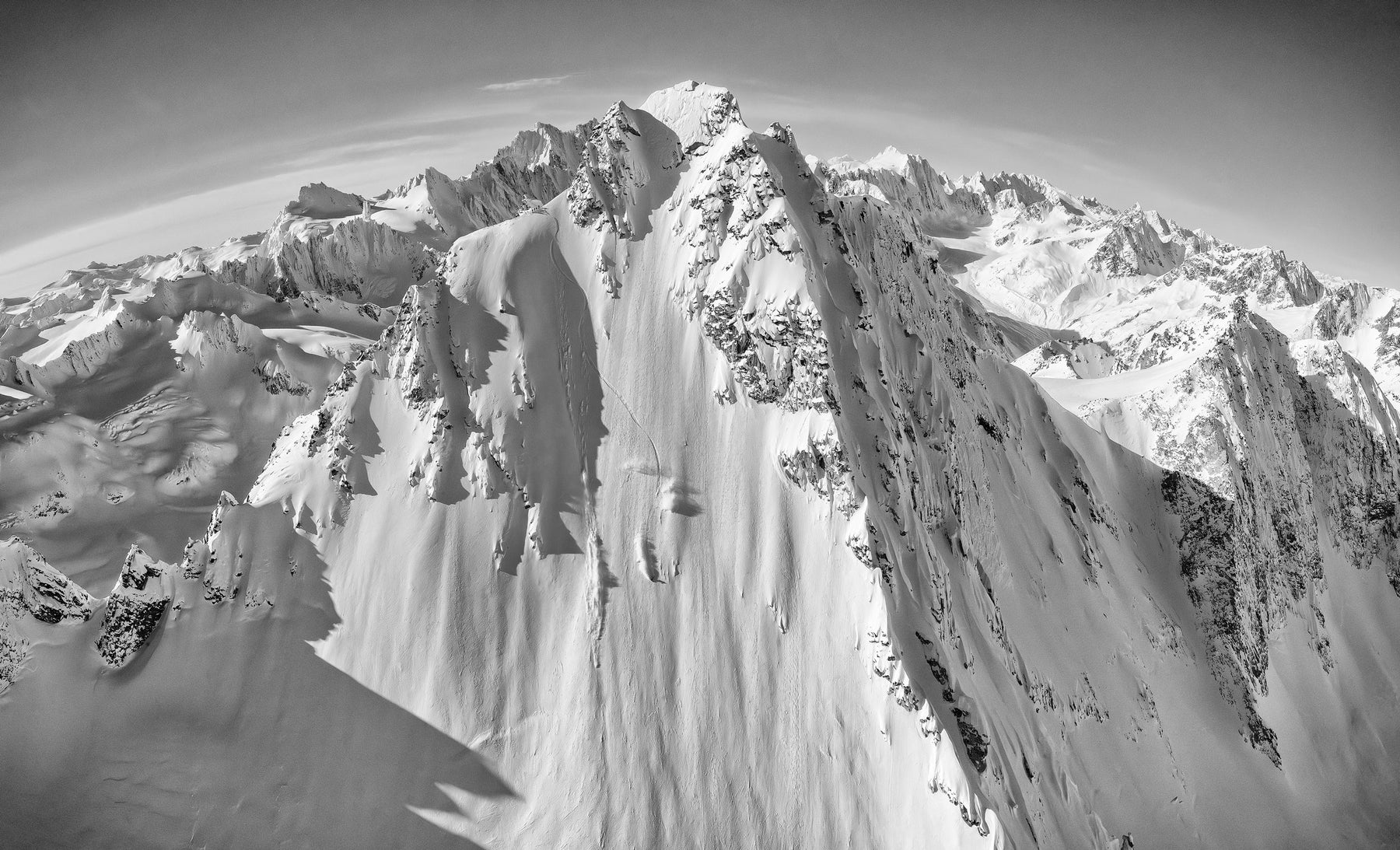 High above the jagged Alaskan peaks, a lone skier carves an impressive line down the untouched face of a massive snow-cloaked mountain. The line named "Desktop East" is a proving ground for all skiers. Captured from the helicopter with the doors open in order to show this incredible field of view endless mountain peaks with the Garrison Glacier below. This image reveals the raw grandeur of Haines—vast, towering spines and ridges draped in deep snow, glowing under the crisp northern light. The untouched slope is steep and formidable, a natural canvas of white, broken only by the skier’s daring descent. A land of rock, ice and snow!