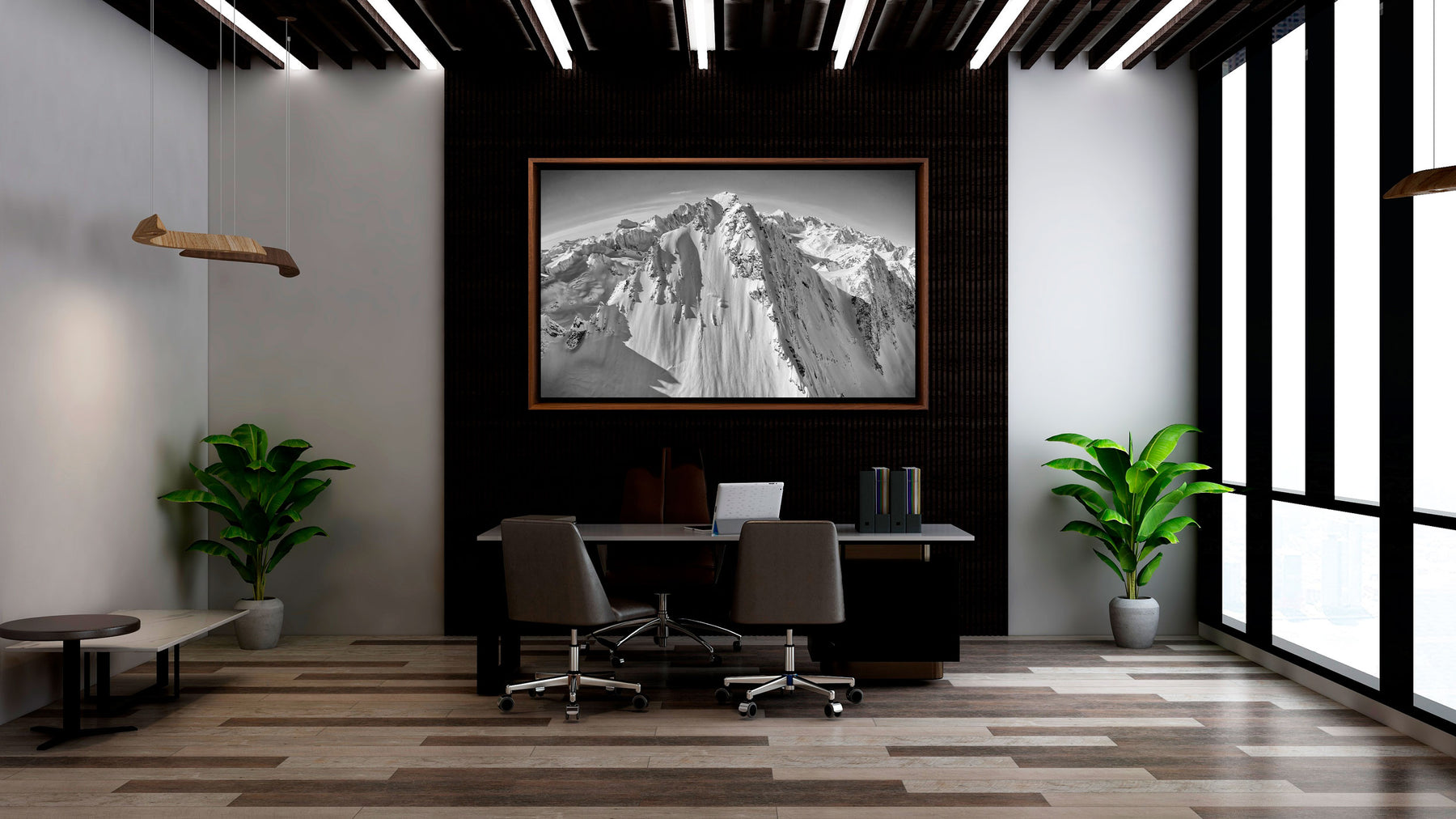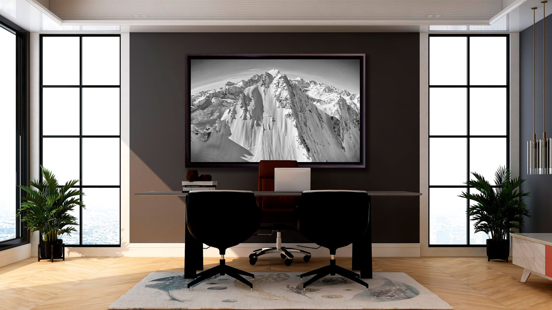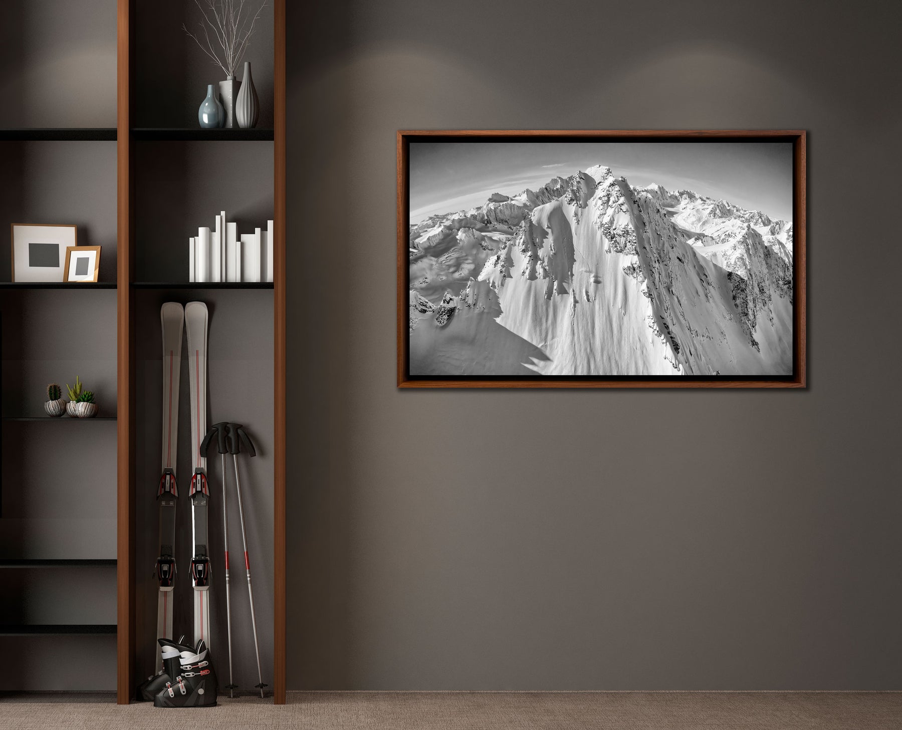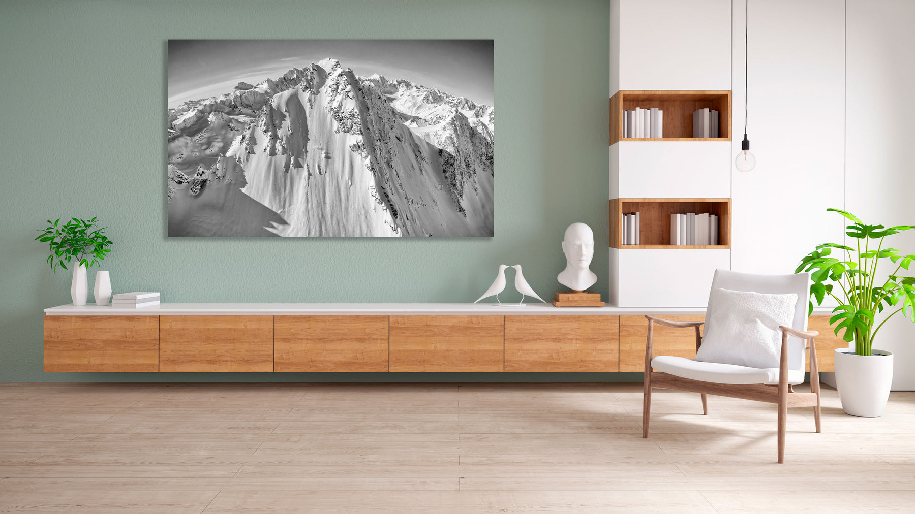 High above the jagged Alaskan peaks, a lone skier carves an impressive line down the untouched face of a massive snow-cloaked mountain. The line named "Desktop East" is a proving ground for all skiers. Captured from the helicopter with the doors open in order to show this incredible field of view endless mountain peaks with the Garrison Glacier below. This image reveals the raw grandeur of Haines—vast, towering spines and ridges draped in deep snow, glowing under the crisp northern light. The untouched slope is steep and formidable, a natural canvas of white, broken only by the skier’s daring descent. A land of rock, ice and snow!