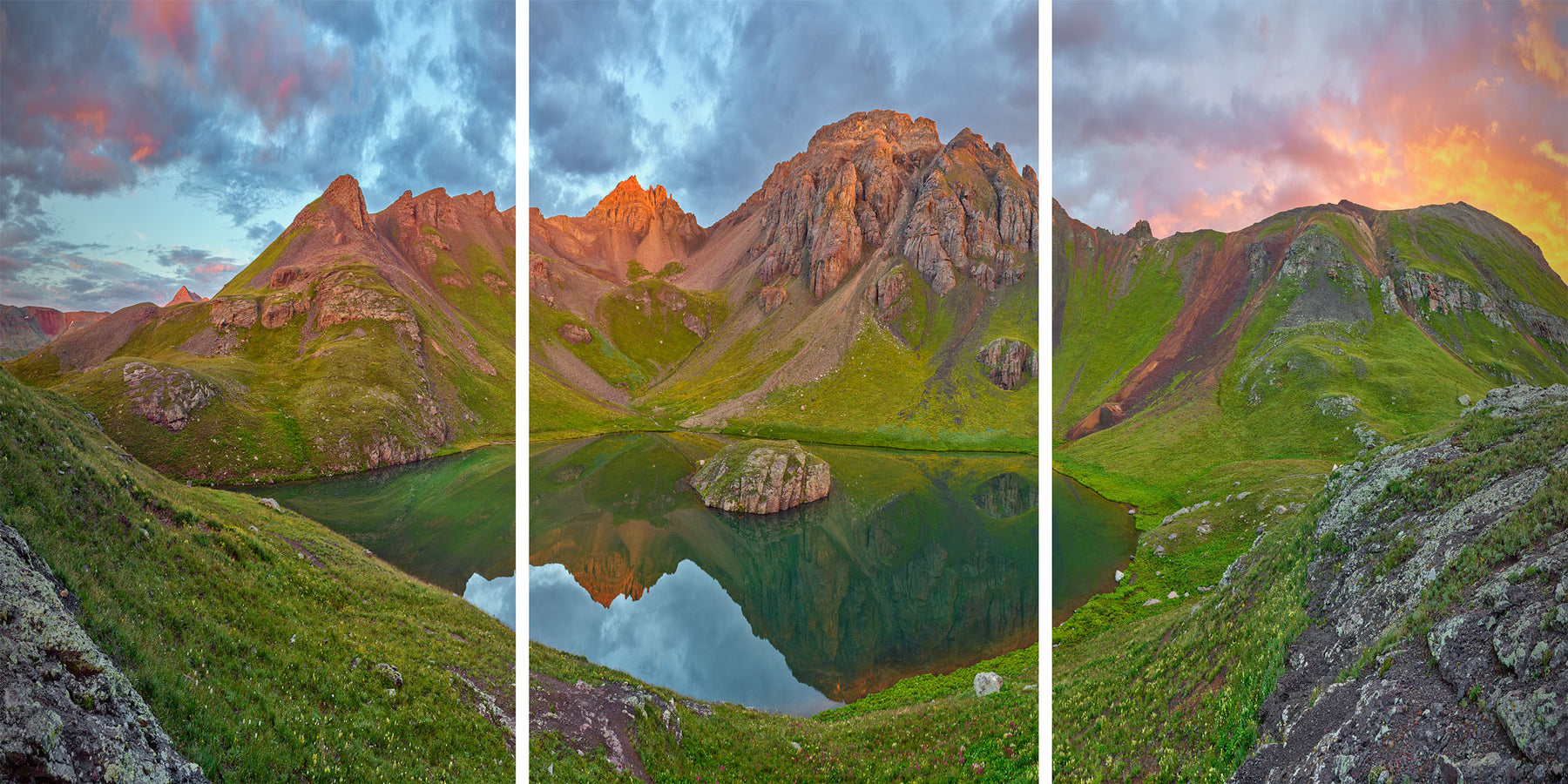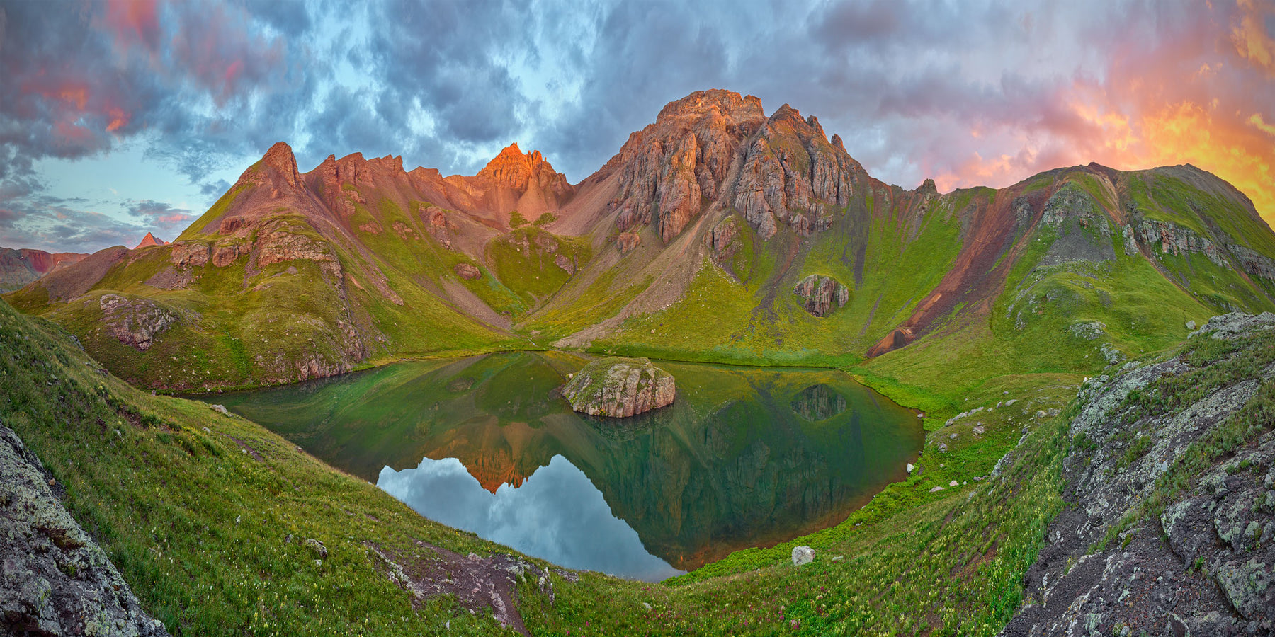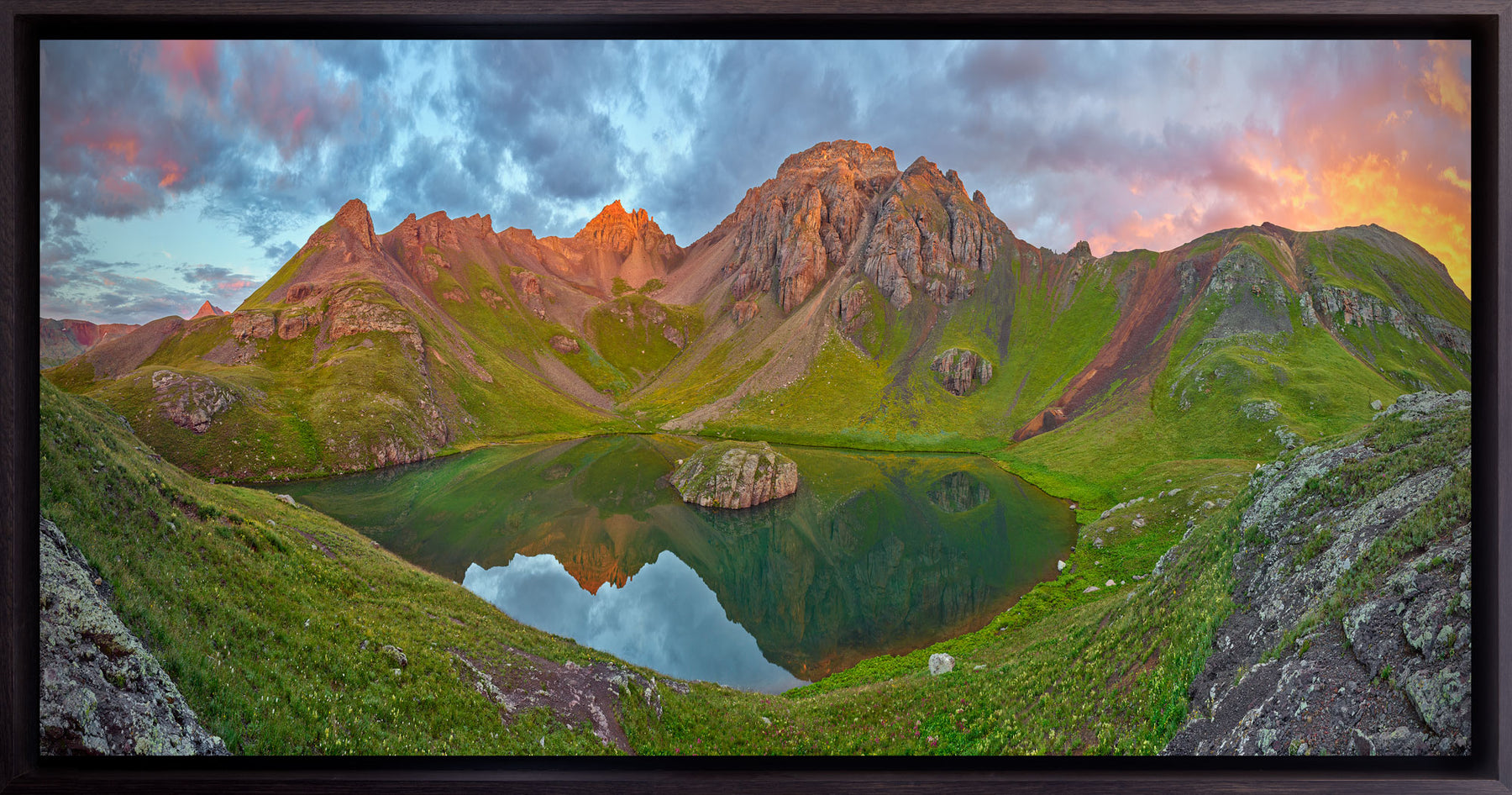 A magical summer morning of light and color after days of rain. As darkness faded to light I was in amazement of the scene that revealed itself. A high alpine lake sits nestled among the wildflowers as Ulysses S Grant Peak (13,714 ft) guards over this pristine sanctuary. It rained for 3 days with only limited opportunities to get out and hike around so this morning was welcomed as the clearing storm lit the sky on fire as the mountain sides bathed in morning alpine glow. The stunning reflection, alpine wildflowers and sunrise color made this whole basin seem like it was taken straight out of a fairytale. This panorama is composed of 6 image that bring you an incredible field of view.