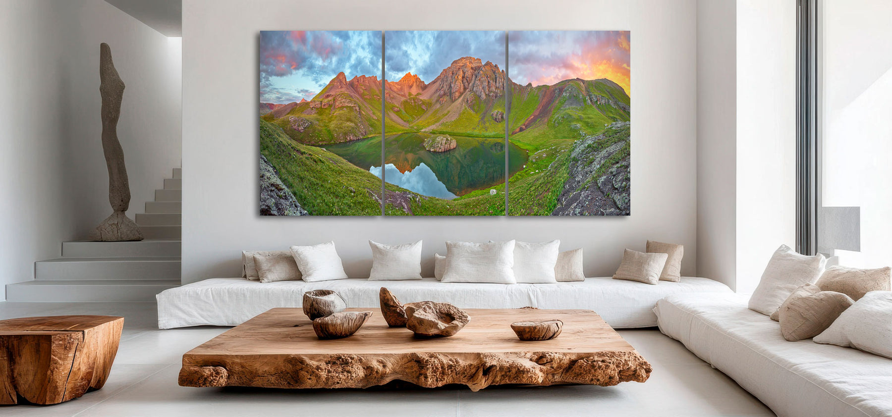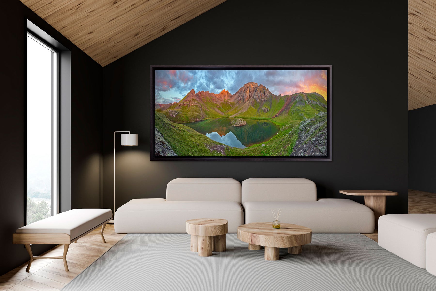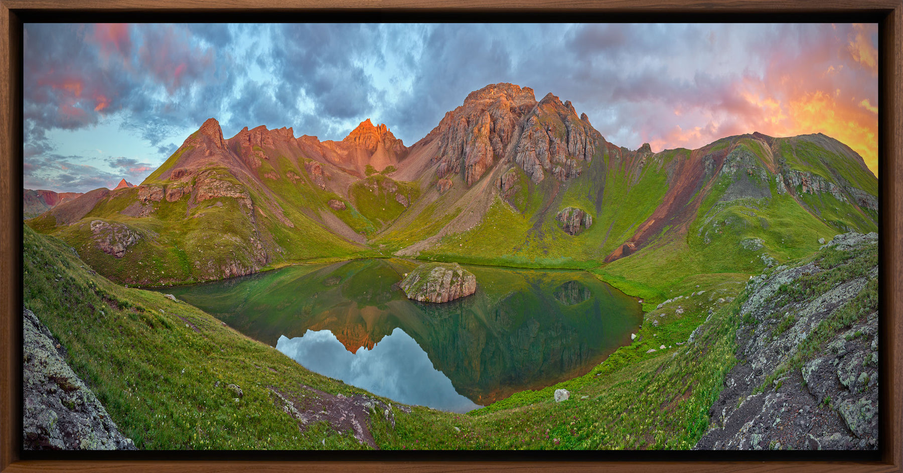 A magical summer morning of light and color after days of rain. As darkness faded to light I was in amazement of the scene that revealed itself. A high alpine lake sits nestled among the wildflowers as Ulysses S Grant Peak (13,714 ft) guards over this pristine sanctuary. It rained for 3 days with only limited opportunities to get out and hike around so this morning was welcomed as the clearing storm lit the sky on fire as the mountain sides bathed in morning alpine glow. The stunning reflection, alpine wildflowers and sunrise color made this whole basin seem like it was taken straight out of a fairytale. This panorama is composed of 6 image that bring you an incredible field of view.