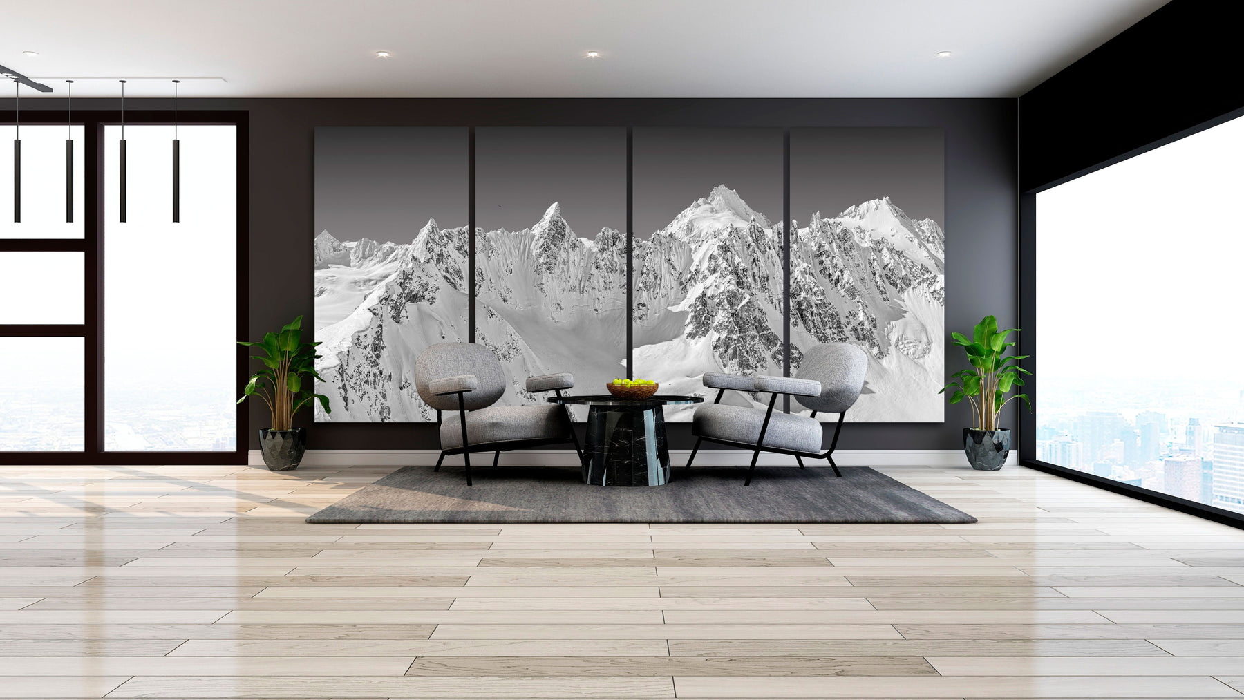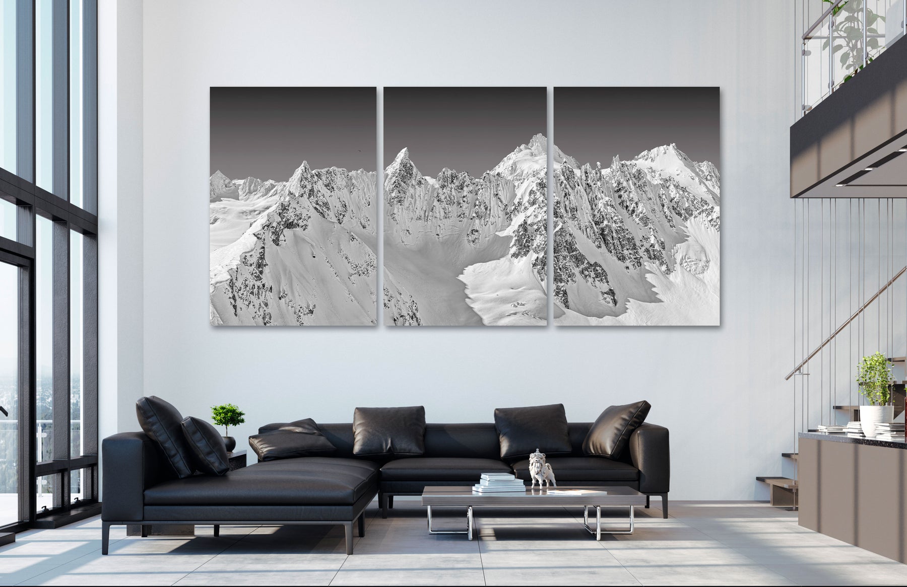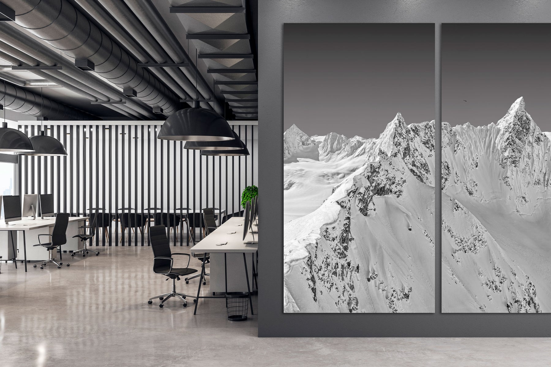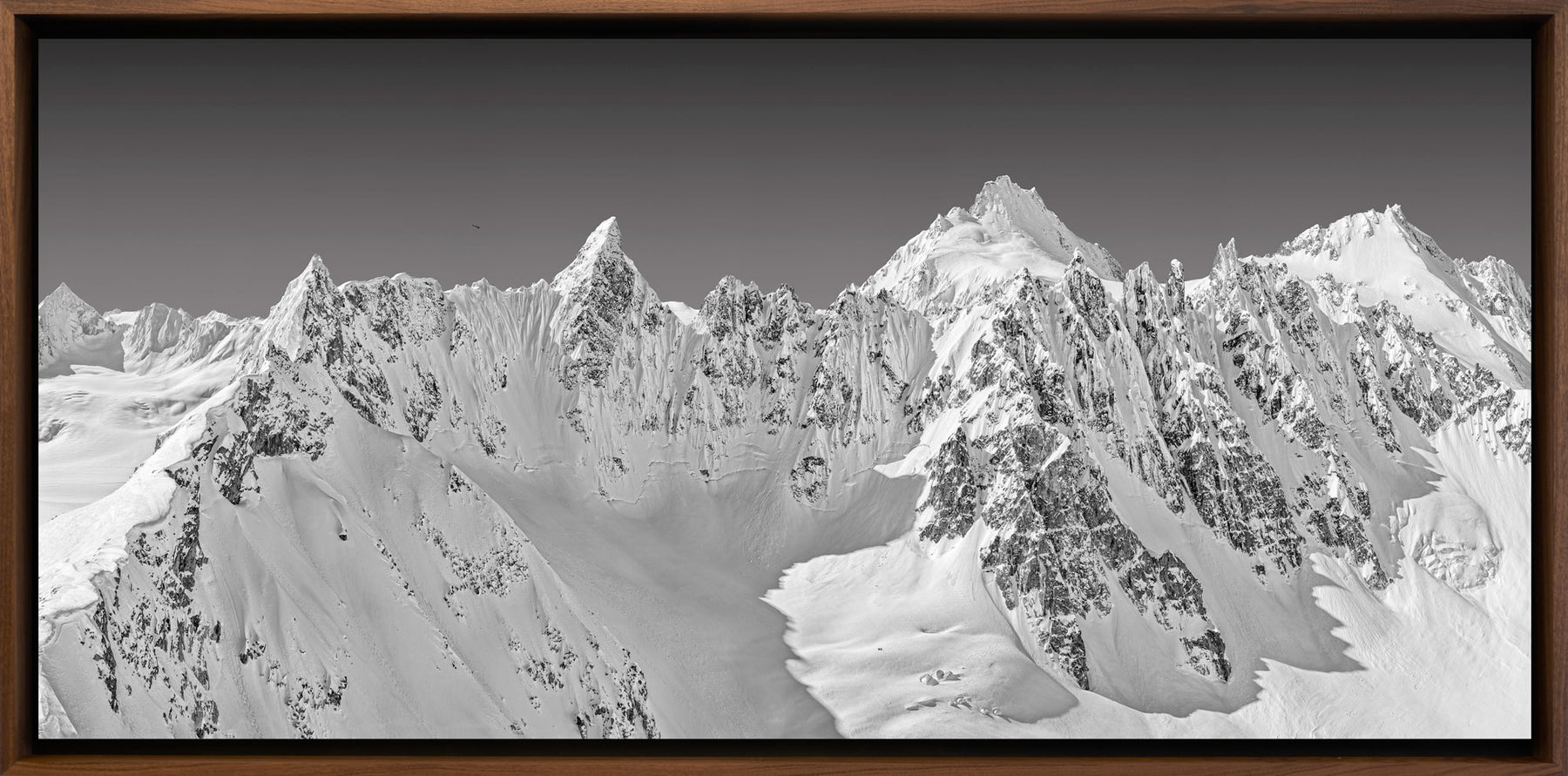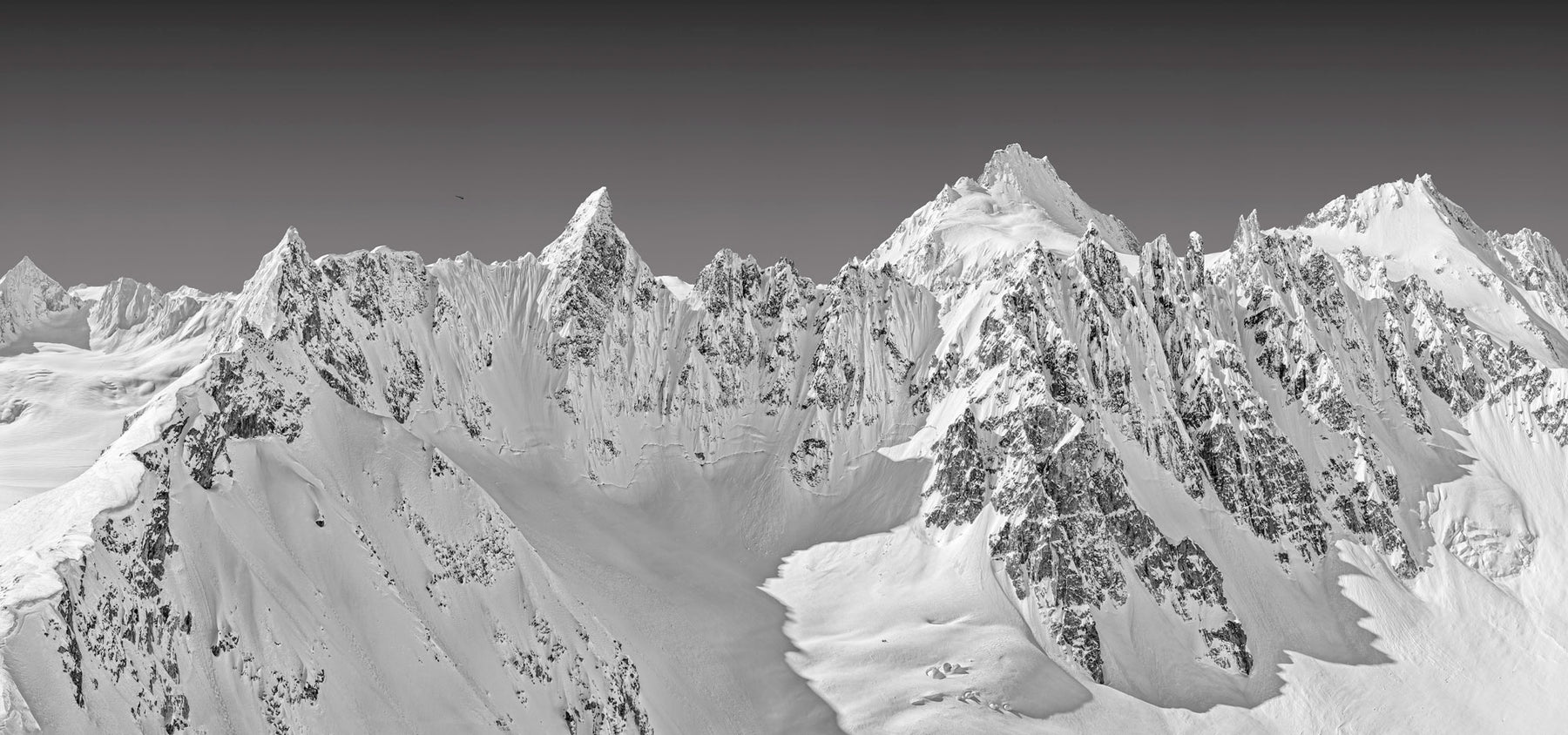 This incredible large scale panoramic image of the Chilkat mountains inspires mountaineers and skiers alike. Taken in the spring of 2024 on a project with Matchstick Productions filming the ski film “Calm Beneath Castles”. There are 4 athletes skiing the spine wall to the left of the jagged fang peak just left of center. Working with top notch athletes that included Colby Stevenson, Karl Fostvedt, Finn Bilous and Emily Childs. Taken after 3 days of filming and working up to this incredibly high consequence line the athletes felt confident and tackled this monster of a line head on. The last time this line was skied (2013)a skier passed away due to a cornice fall where 4 skiers tumbled down the face - RIP. The line was then named the Konop-inator after one of the survivors. This day was a wonderful redemption of this line in this majestic setting where the snow seems to stick to the vertical walls of the Kicking Horse mountain feature. The true definition of gnarly terrain as so much goes into being able to ski and navigate this terrain from cornices, spines, bergschrunds and avalanches. Composed of about 125 images to make this massive image meant for full wall art installations to bring you literally into the mountains to experience this scene in person. Enjoy!